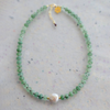 This gemstone necklace is made with faceted Sage rondelle beads. Small seed beads are placed between the gemstones for added detail and feature a coin pearl in the center of the necklace. Since pearls are natural, each one will vary slightly in size and shape, making every necklace unique. The mix of gemstone beads and the pearl makes this a great piece for everyday wear or layering with other necklaces.