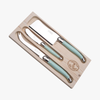 Set of 3 cheese knives with turquoise handles in a wooden box